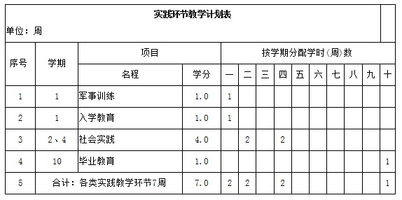 实践环节共4项,7学分。开设:军事训练、入学教育、社会实践、毕业教育等。