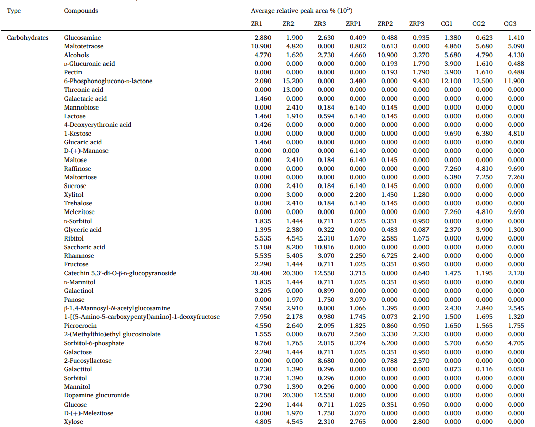 3. ZR、ZRP和CG中代谢物的分析