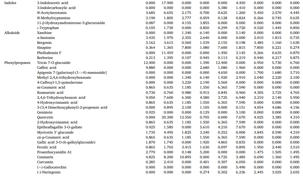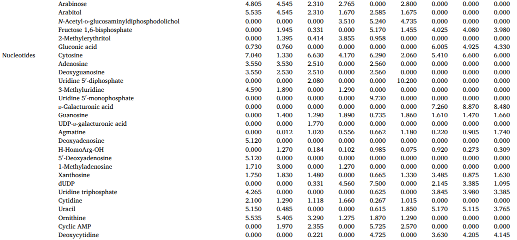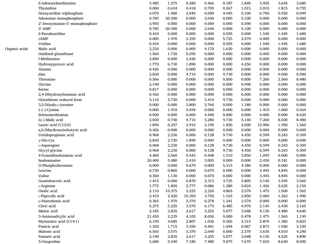 脂类是ZR-CG组中18%的基本区别物质,由于其性质和营养价值,对细胞膜结构和一系列生理活动不可或缺。脂肪分解成游离脂肪酸后,氧化或与其他反应产物反应形成调味化合物,并形成ZR和CG独特的香气特征。核苷酸是ZR和CG中的第四类差异代谢物,是几乎所有生物过程中的关键低分子生物分子,可能与CG的鲜味降低有关。大量证据表明,饮食中核苷酸的来源对免疫功能有重要影响,并维持最佳的生理功能,为ZR和CG免疫调节配方和营养产品的开发提供了支持数据。其他标志性代谢物在ZR和CG中也显示出一些具有多方面药理作用的特征成分,如姜辣素、6-姜烯酚和二芳基庚烷类化合物。CG的抗氧化能力远远低于ZR,这是由于上述成分的含量减少了。