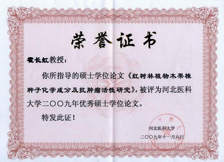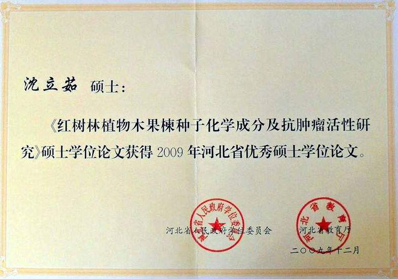 近日接我校研究生院通知:根据《河北省人民政府学位委员会关于做好河北省2009年优秀硕士学位论文评选工作的通知》,经专家组评议及公示,我室教师霍长虹副教授指导的05级硕士研究生沈立茹撰写的论文《红树林植物木果楝种子化学成分及抗肿瘤活性研究》被评为小奶猫直播 2009年优秀硕士学位论文、2009年河北省优秀硕士学位论文。
