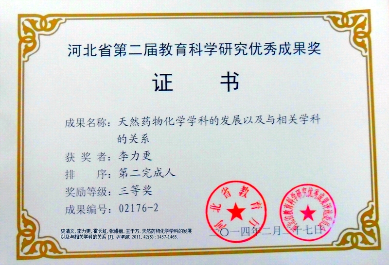 我室审报的获奖论文成果是《天然药物化学学科的发展以及与相关学科的关系》,完成人:史清文,李力更,霍长虹,张??丽,王于方。